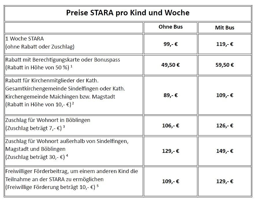 Leider gingen an uns die Preissteigerungen der letzten Jahre nicht spurlos vorbei. Durch die untenstehenden Preisstaffelungen und Preiserhöhungen hoffen wir, dass wir auch in Zukunft die STARA weiterhin finanzieren und Ihren Kindern eine Ferienbetreuung im Sommer bieten können. Falls sie Fragen zur Preiszusammenstellung haben, melden Sie sich gerne bei uns. Sollten Sie Probleme haben die Kosten für Ihr Kind/ Ihre Kinder tragen zu können, setzten Sie sich auch gern mit uns in Verbindung, gemeinsam finden wir eine Lösung.